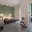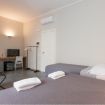 Ampia camera di 21 mq al piano terra con balcone vista cortile. Dotata di accessori adeguati alle esigenze personali. Letto matrimoniale o letti separati e un letto singolo. Bagno con doccia e finestra, sanitari comodi, campanello salvavita. Colazione inclusa. Posto auto riservato nel parcheggio non custodito interno dell’hotel.